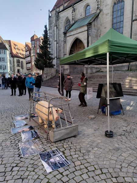 Trotz der Kälte haben wir im November eine Aktion durchgeführt, bei der wir aufzeigten, wie wenig Platz Mutterschweine im Kastenstand haben – unterstützt mit einer Plastik-Sau in einem Kastenstand und Videoaufnahmen aus der Schweinezucht in Baden-Württemberg. Außerdem nahmen wir Mitte November an der Neubürger*innenbegrüßung der Stadt Tübingen in neuem Format teil und erreichten das Publikum durch ein Video sowie einen Infostand.