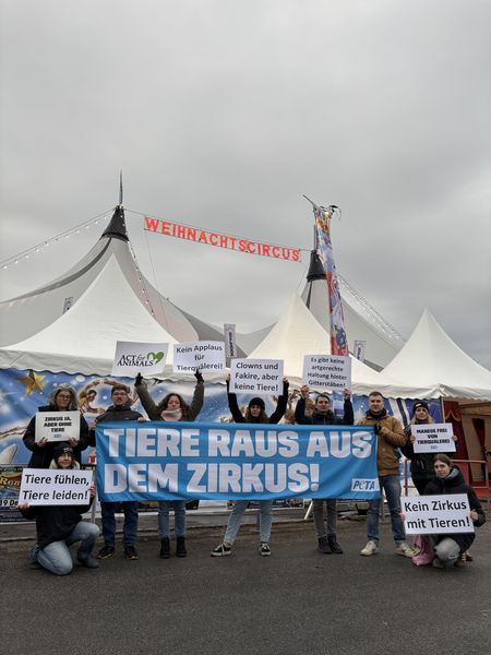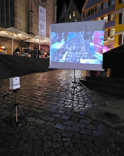 Auch im Dezember waren wir weiter auf der Straße aktiv und haben zweimal eine Pelz-Beamer-Aktion durchgeführt, bei der wir den Passant*innen mithilfe eines projizierten Videos aufzeigten, was für ein großes Leid hinter der Pelz-Industrie steckt. Außerdem konnten wir eine gemeinsame Aktion mit dem „PETA Streetteam Tübingen“ durchführen. Wir haben vor dem Reutlinger Weihnachtscircus eine Kundgebung gegen Tiere im Zirkus abgehalten.